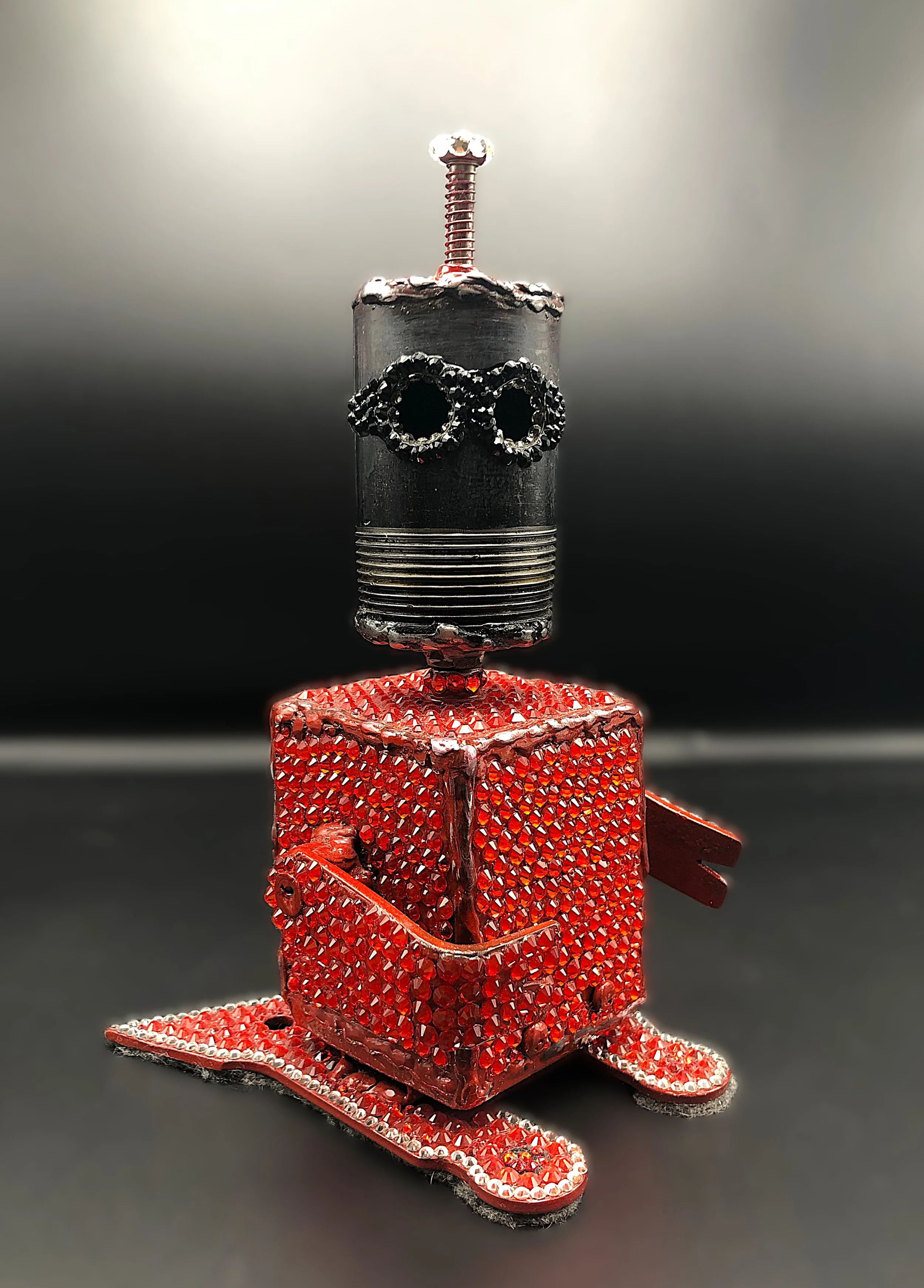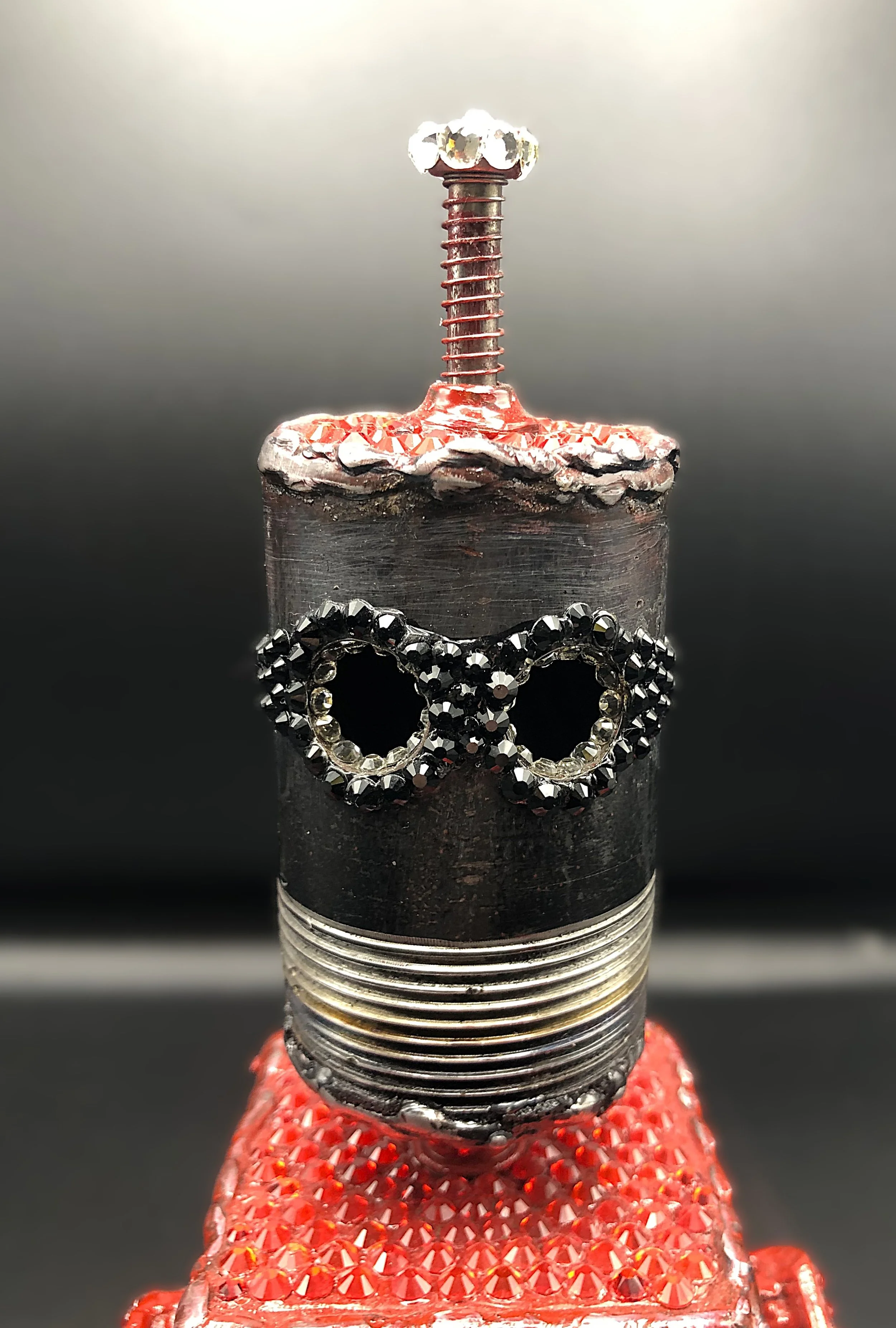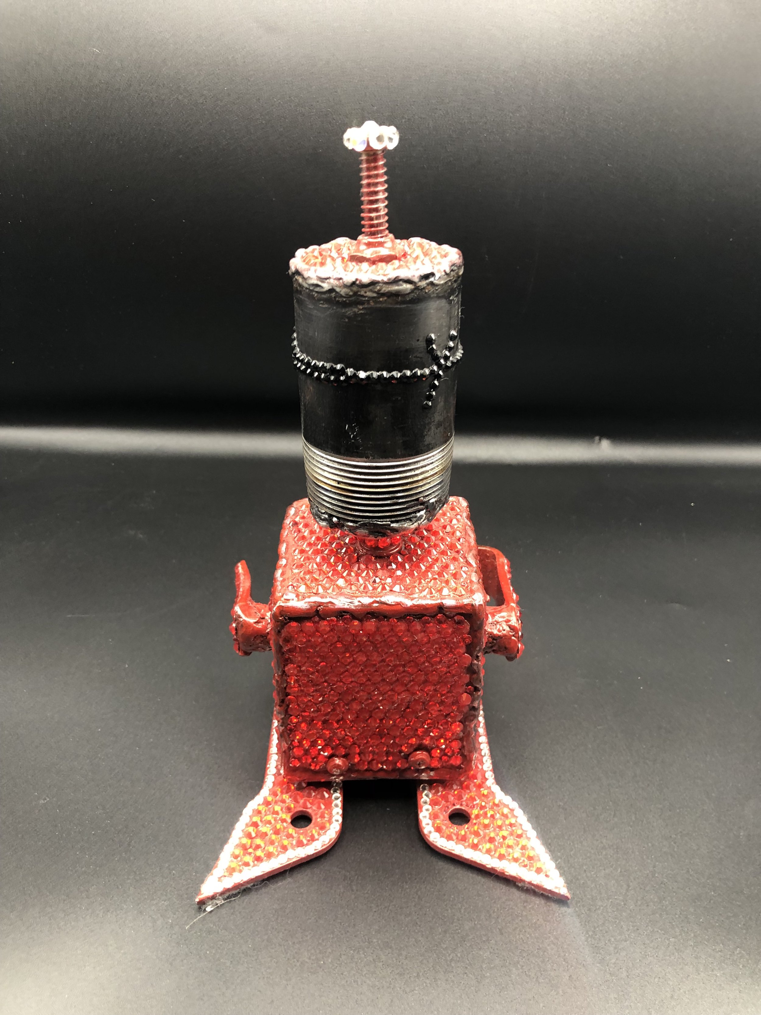 Handmade welded robot zombie made from steel sheet, tube stock, pipe, and parts of old tools. Each robot is thoroughly clear coated to protect the finished product. This is number 076 with a tag numbered, dated and signed. My robots are produced in groups and have variations in size, weld design and hand attachments. Moving part is the head only. Parts are both bolted and welded. Product can contain sharp edges and is meant to be used as welded artwork. NOT A TOY. Made in the USA LEVITTOWN PA. Check out the others.